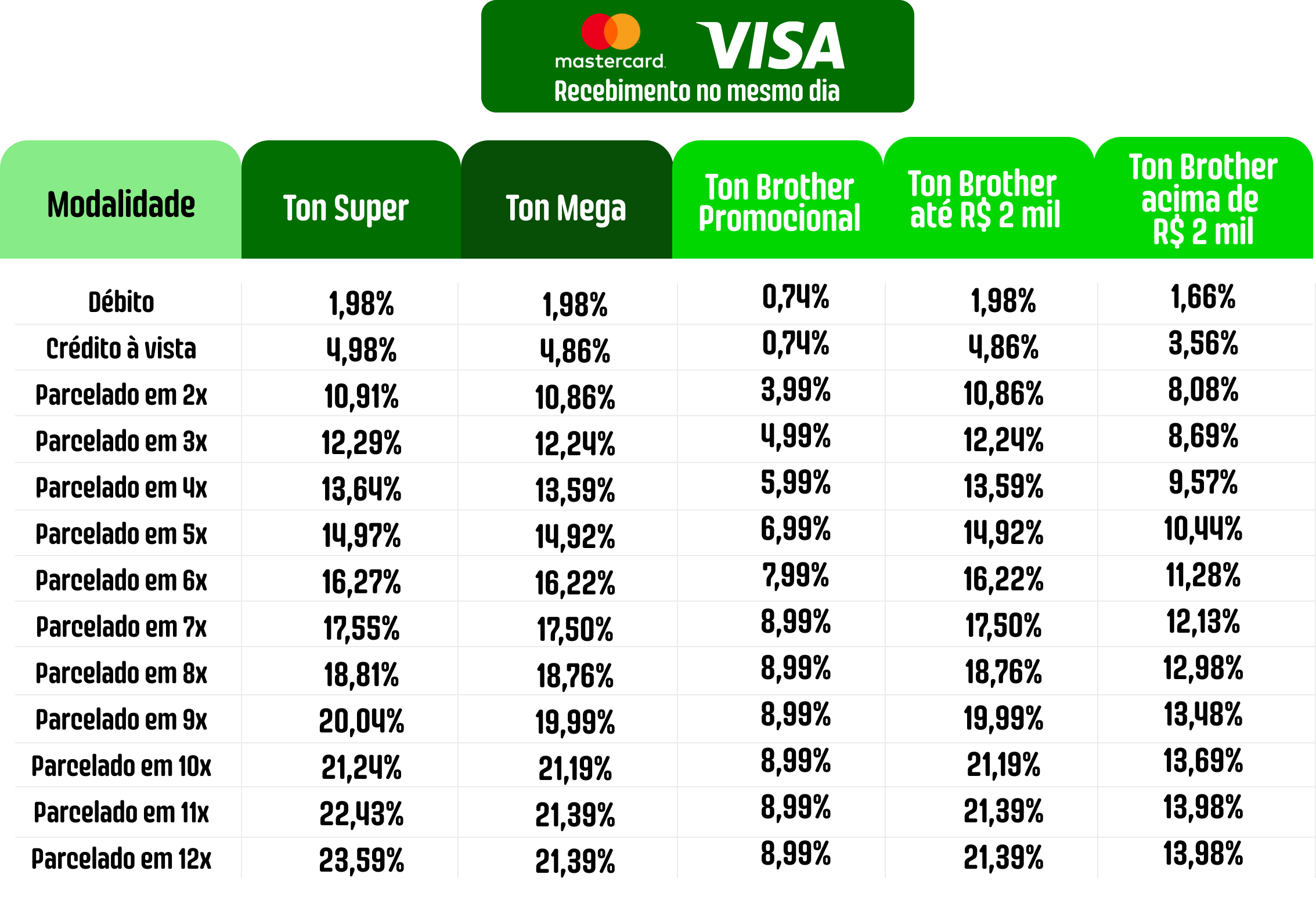 No plano Ton Mega e Ton Super, as maquininhas têm preços mais baratos e as taxas não mudam de acordo com as suas vendas mensais.